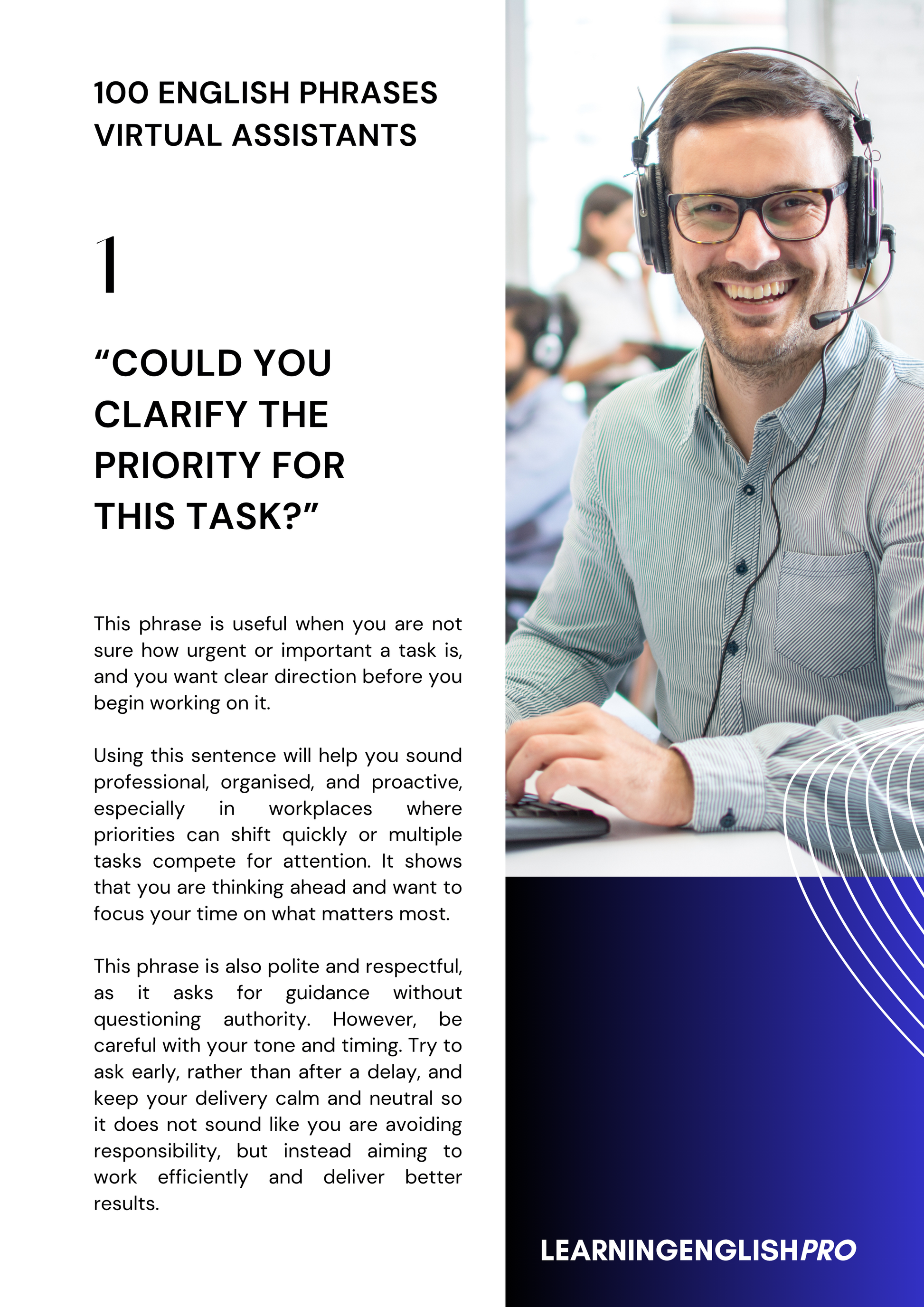 Improve your Business English with 100 practical phrases for virtual assistants. This downloadable PDF helps you sound more professional in emails, task updates, scheduling, customer communication, file management, teamwork, and workplace problem-solving. Designed for intermediate English learners and paired with a free YouTube audio lesson.