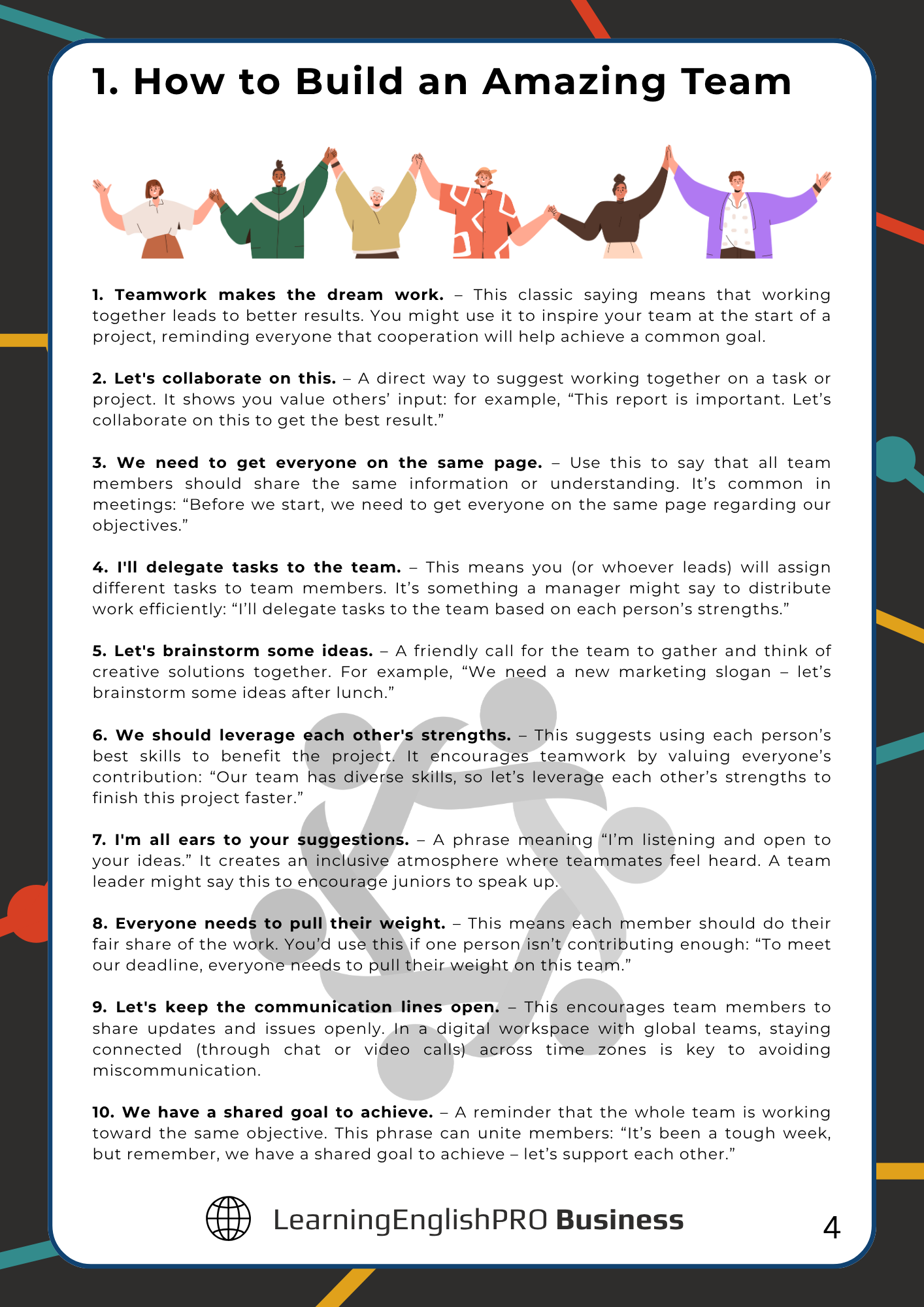 This professional Business English guide from LearningEnglishPRO includes 100 workplace phrases, each clearly explained and grouped into real-world themes like leadership, negotiation, emails, networking, and more.